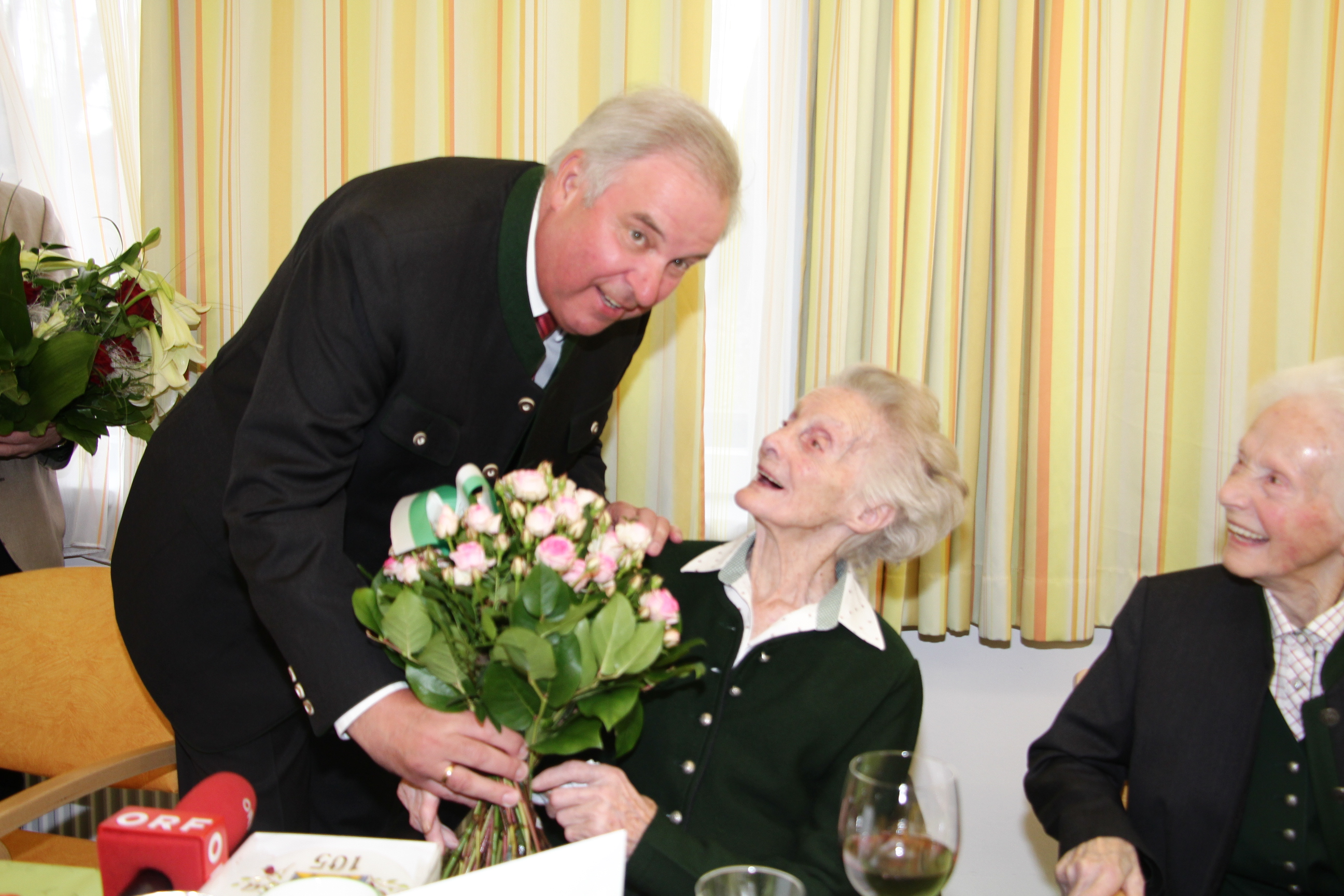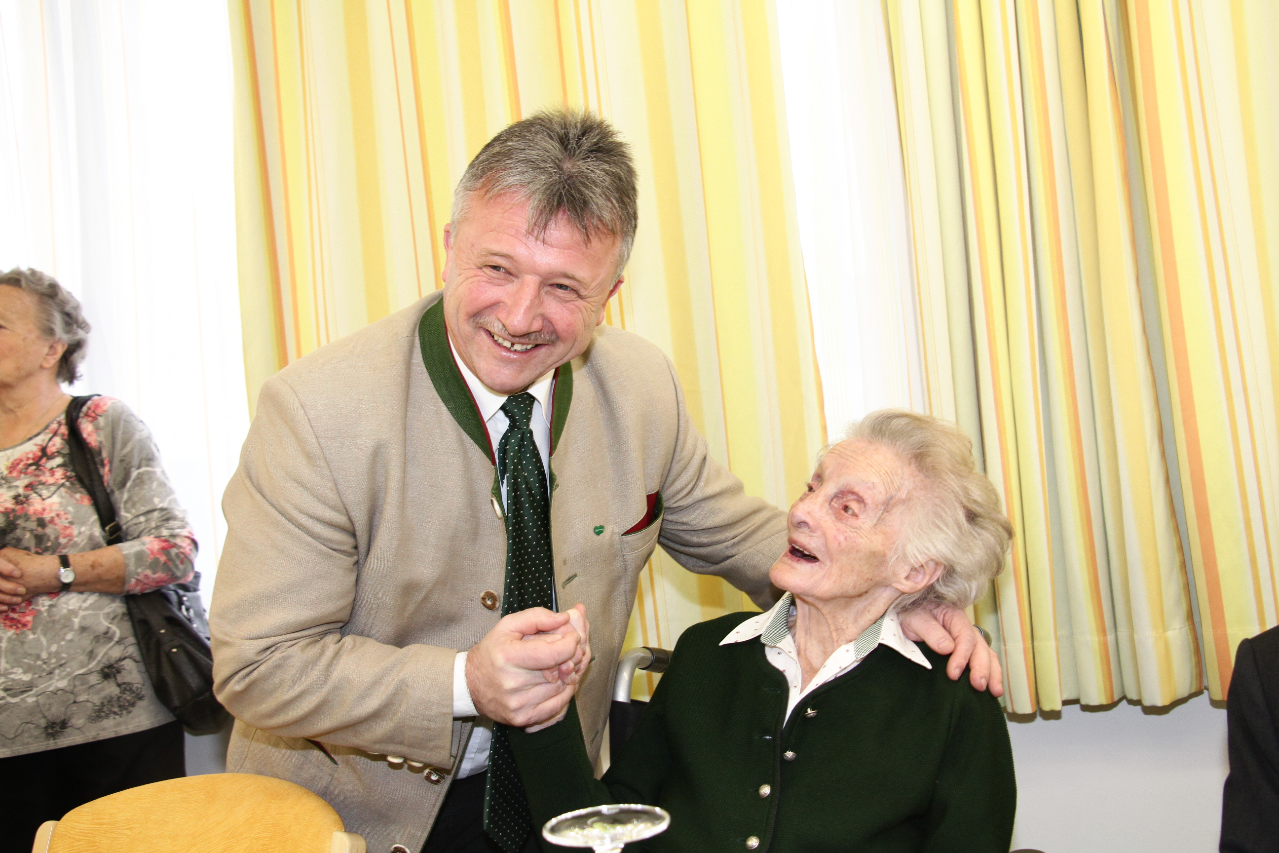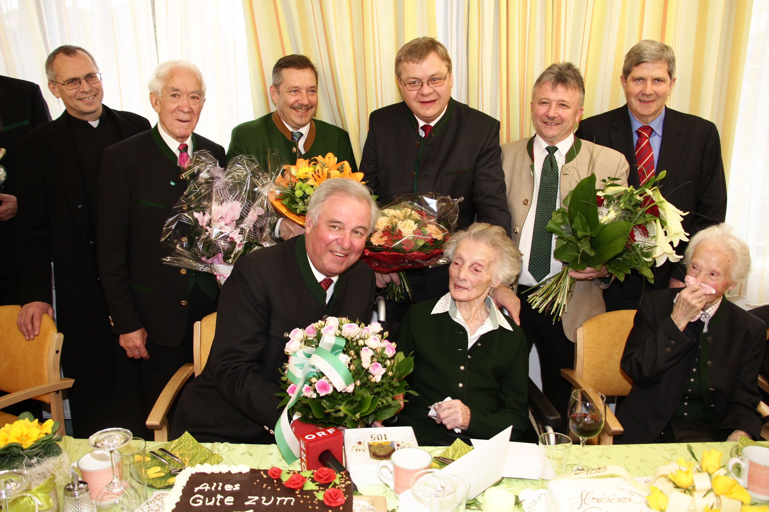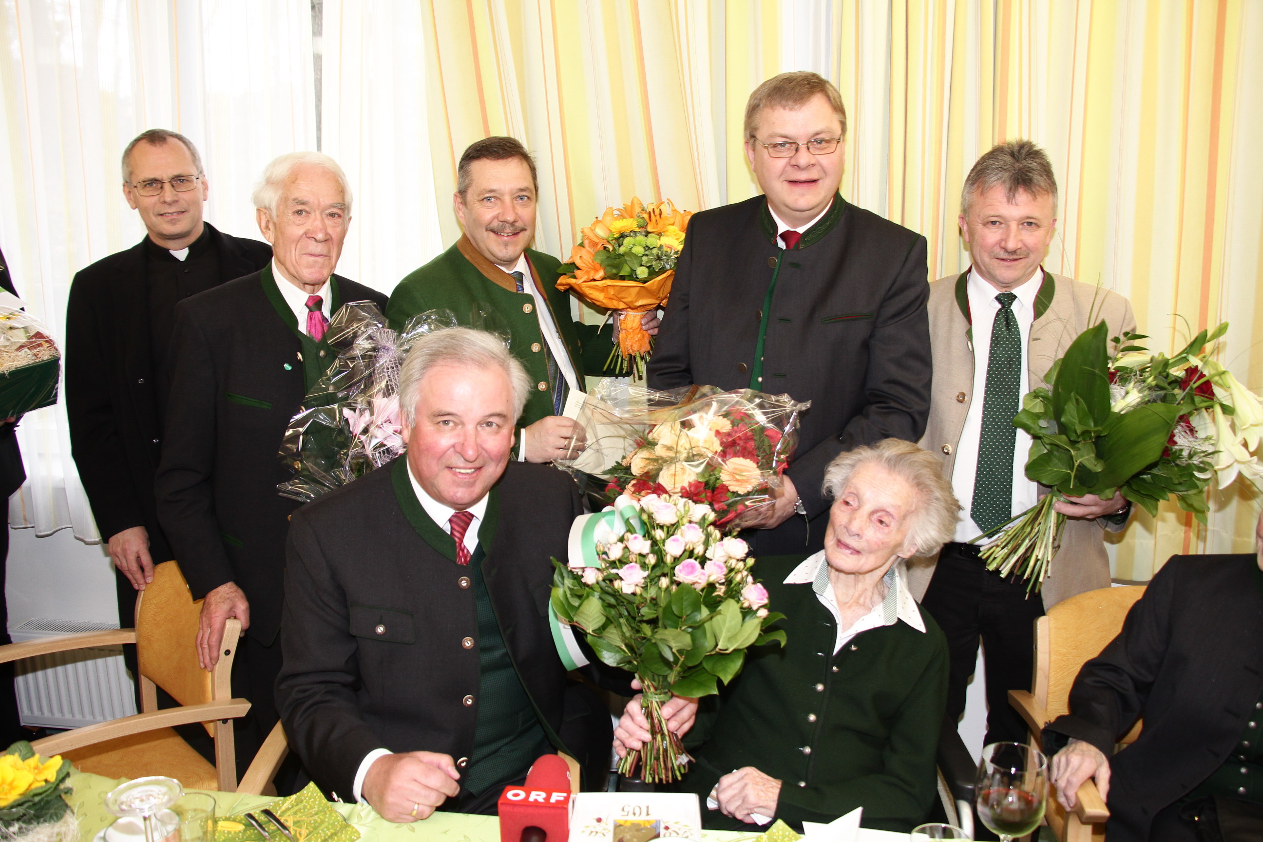Landeshauptmann Hermann Schützenhöfer ließ es sich nicht nehmen persönlich zu diesem außergewöhnlichen Ehrentag zu gratulieren. Als weitere Gratulanten stellten sich auch LAbg. Hubert Lang, Bgm. Johann Schirnhofer und Bgm. Josef Hauptmann sowie der Pöllauer Pfarrer Roger Ibounigg ein.