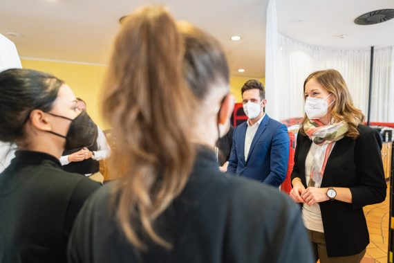 Mittlerweile sieben Mal zur beliebtesten Therme Österreichs ausgezeichnet wurde das Rogner Bad Blumau. Ebenso ausgezeichnet ist die Lehrlingsausbildung im Unternehmen mit über 300 Mitarbeiterinnen und Mitarbeitern. Mit eigener Lehrlingsakademie und Förderung des Modells Lehre mit Matura versucht der Tourismusbetrieb seinen Lehrlingen ein breites Fachwissen und persönliche Entwicklungsmöglichkeiten zu bieten. „Es ist uns ein großes Anliegen jungen Menschen in unserem Betrieb individuelle Möglichkeiten zu bieten ihr Talent in elf unterschiedlichen Lehrberufen entfalten zu können und für jeden und jede das beste Angebot zu bieten“, so Direktorin Melanie Franke. Beim Besuch war zudem auch die Blumauer Bürgermeisterin Andrea Kohl dabei, die besonders stolz auf diesen Vorzeigebetrieb in ihrer Gemeinde ist. (Fotos: BKA/Schrötter)