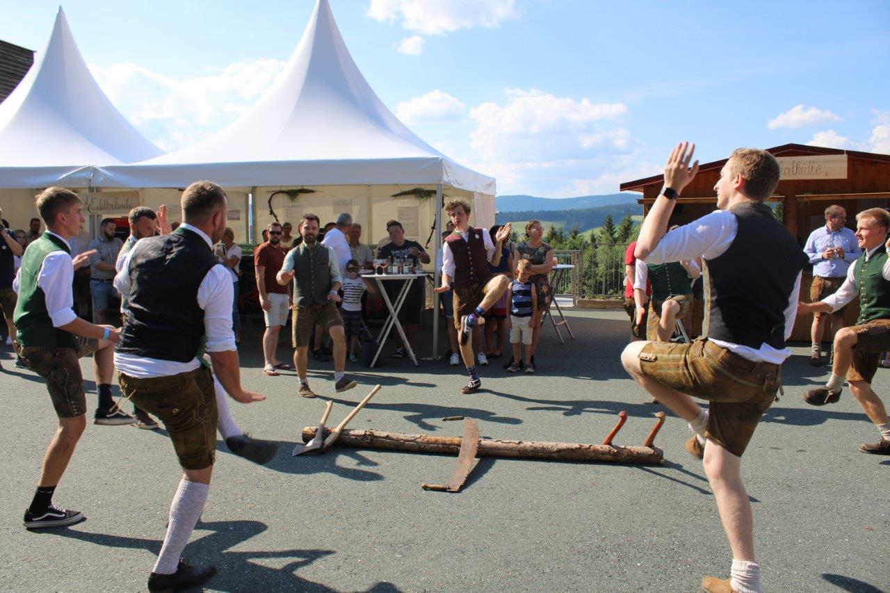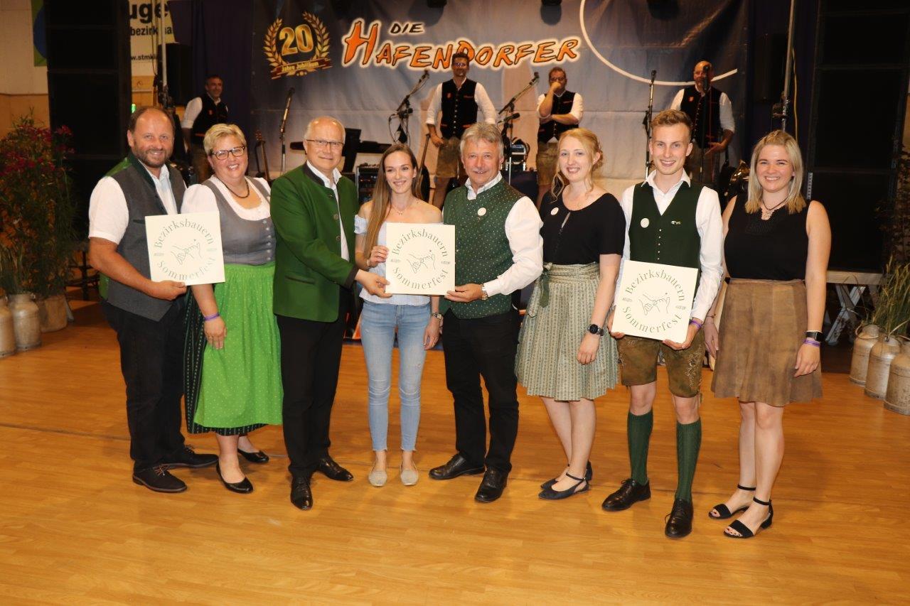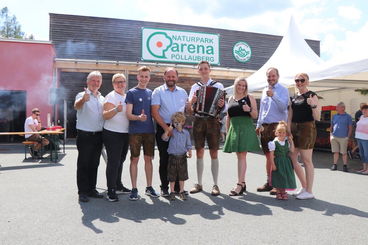 Als Alternative zum Bezirksbauernball, der heuer erneut der Pandemie zum Opfer fiel, luden der Bauernbund und die Landjugend rund um Sonnwend zum ersten Bezirksbauern-Sommerfest in die Naturparkarena Pöllauberg. Und das Programm hatte jede Menge zu bieten. Zu den Highlights zählten Schuhplattlervorführungen der Landjugend Ortsgruppe Hartberg, Überflüge der Steirischen Hagelabwehr und Top-Unterhaltung mit der Band „Die Hafendorfer“. Birgit Kropf aus Puch bei Weiz durfte sich für den Entwurf des Festlogos über einen tollen Preis freuen.