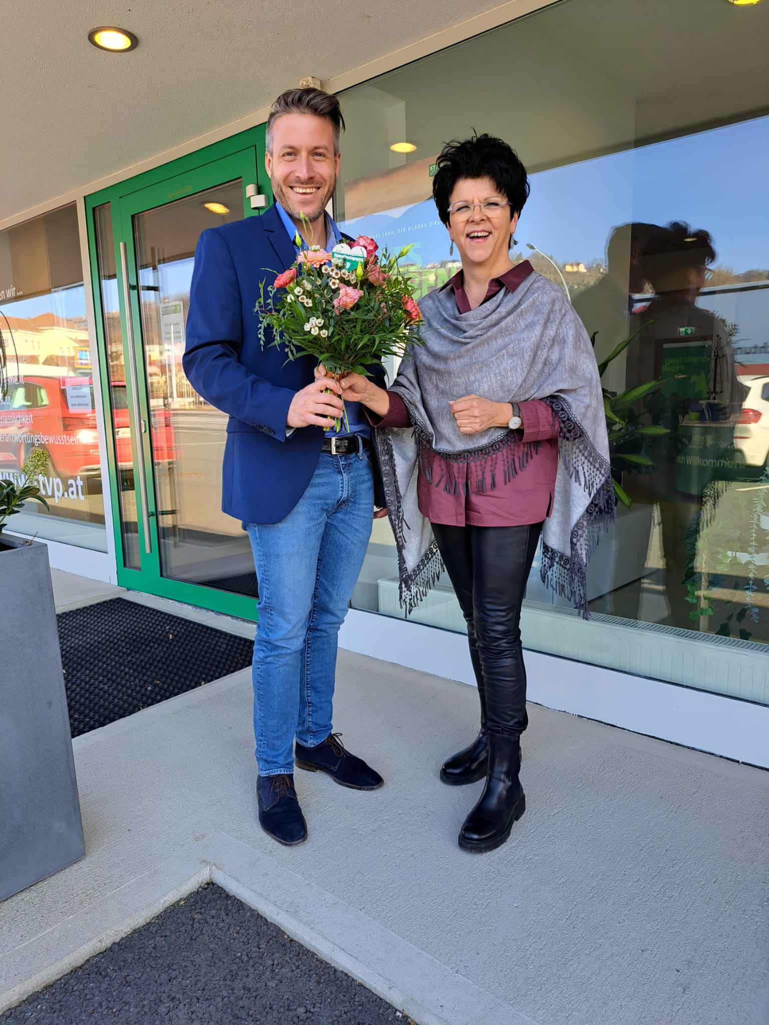 Volkspartei Bezirksparteiobmann LAbg. Lukas Schnitzer und Landesparteiobmann-Stellvertreter Bgm. Marcus Martschitsch waren im Hartberger Rathaus als Blumenkavaliere unterwegs.