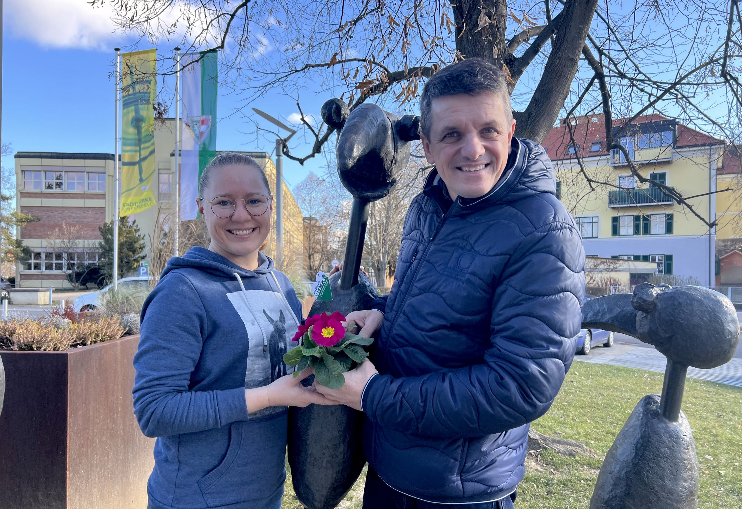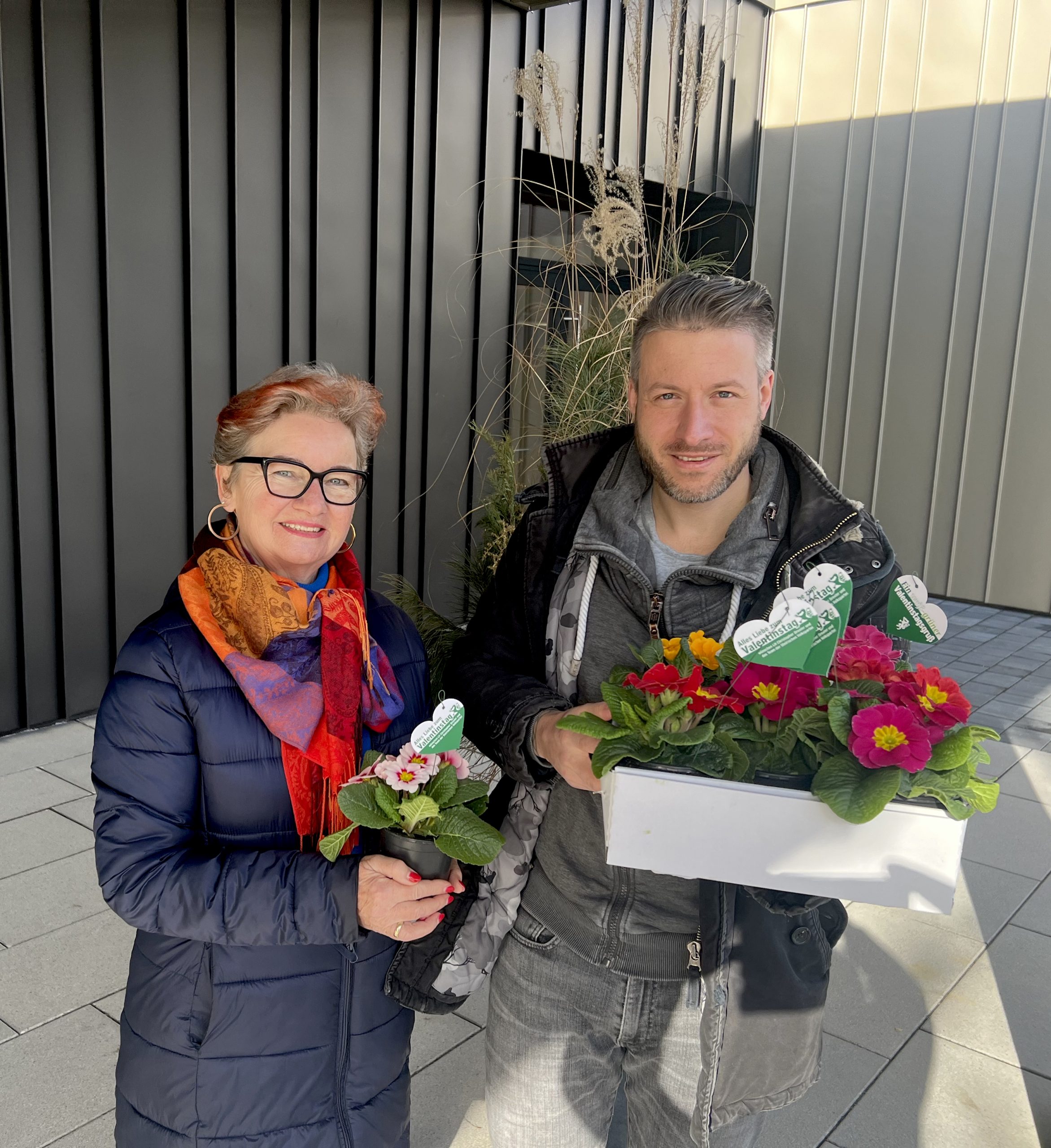 Der Fürstenfelder Bürgermeister Franz Jost und Bürgermeisterin Andrea Kohl aus Bad Blumau nutzten den Valentinstag für eine kleine Verteilaktion von regional gekauften Blumengrüßen in ihren Gemeinden.