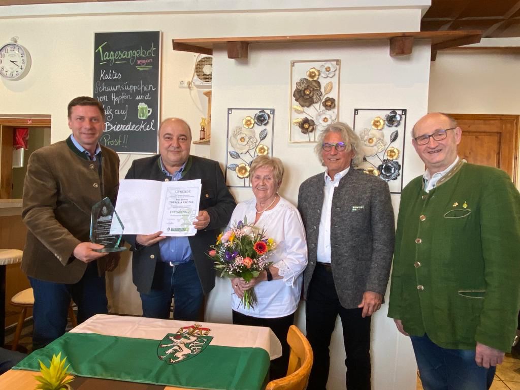 Ehrenobfrau Resi Freitag mit den Gratulanten LGF Friedrich Roll, Bgm. Ing. Jürgen Peindl, Obmann Gerhard Rosenthal, BO-Stv. Franz Winkler