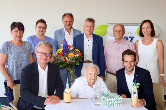 Erika Strohrigel feierte ihren 107. Geburtstag und ist damit nicht nur die älteste Bewohnerin der Bezirkshauptstadt Hartberg, sondern auch die älteste Steirerin. Als Gratulanten stellten sich Landeshauptmann Christopher Drexler, LAbg. Lukas Schnitzer, Pflegeverbands-Obmann von Hartberg-Fürstenfeld Bgm. Herbert Spirk, Menda-Hausleiter Johann Fuchs und Pflegedienstleiterin Alexandra Peinsipp im Seniorenhaus Menda in Hartberg ein. Als Geschenk gab es neben Blumen auch Eierlikör.