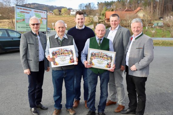 Die Bauernbund-Ortsgruppe Hartl mit Obmann Hans-Peter Spindler und die Ortsgruppe Großhart mit Obmann Vzbgm. Josef Radl gratulierten den langjährigen Mitgliedern Peter Ober und Herbert Weber zum 80. Geburtstag und dankten mit Ehrenurkunden für die Mitgliedschaft zum Bauernbund. Diesen Glückwünschen schlossen sich auch LAbg. Hubert Lang und Bürgermeister Hermann Grassl an. Die Jubilare waren immer mit großem Engagement und Innovationskraft in der Landwirtschaft aktiv und sind seit vielen Jahren Mitglieder des Steirischen Bauernbundes.