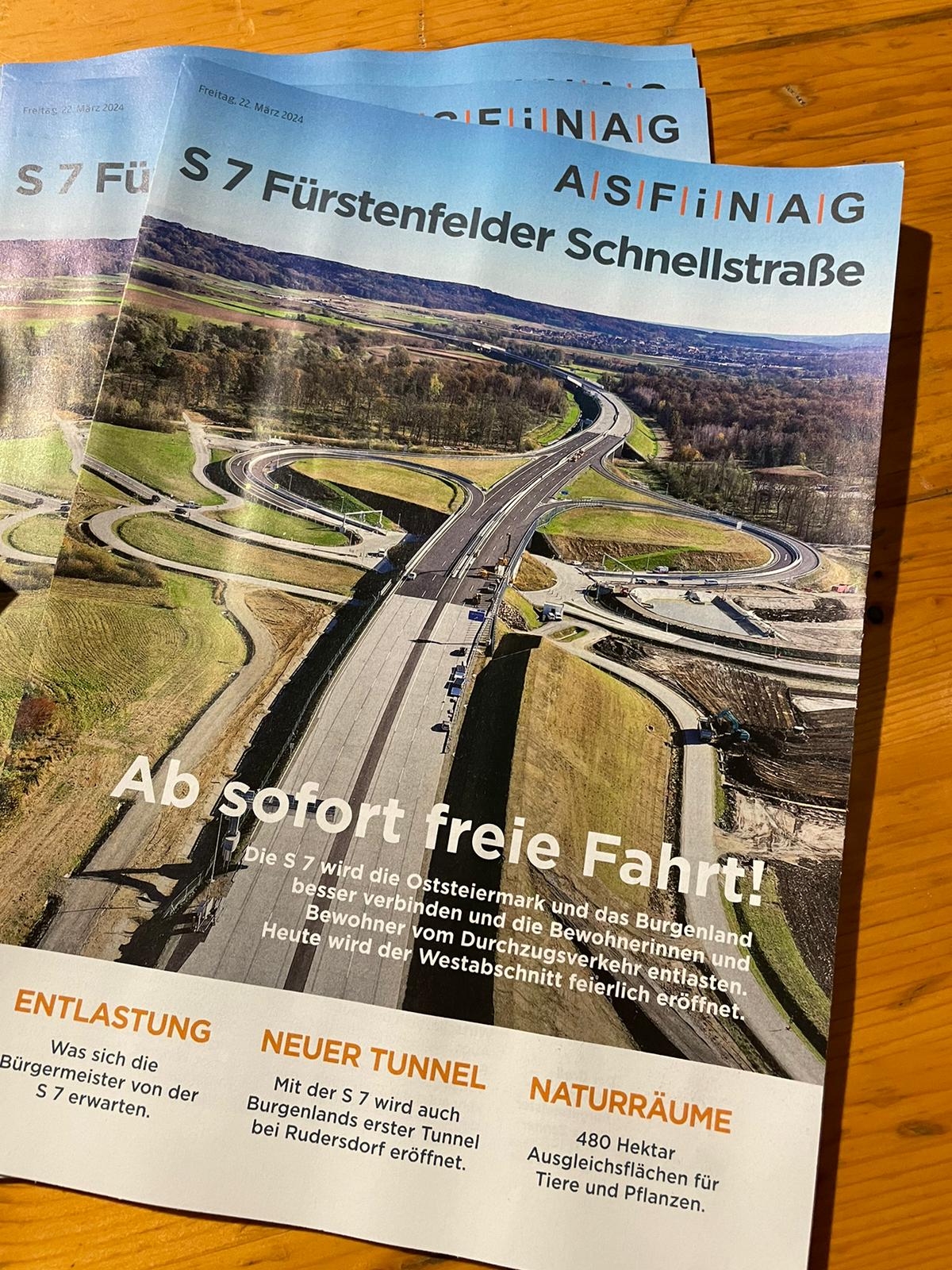 Der erste rund 15 Kilometer lange Abschnitt der S 7 Fürstenfelder Schnellstraße wurde mit einem großen Fest feierlich eröffnet. Die Fertigstellung dieses Teilstücks bringt für die Bevölkerung in der Region eine enorme Entlastung vom Durchzugsverkehr, im Besonderen vom Schwerverkehr. Des Weiteren rücken mit der neuen Verbindung auch die Steiermark, das Burgenland und Ungarn näher zusammen, womit auch neue Möglichkeiten für Wirtschaftsräume entstehen.