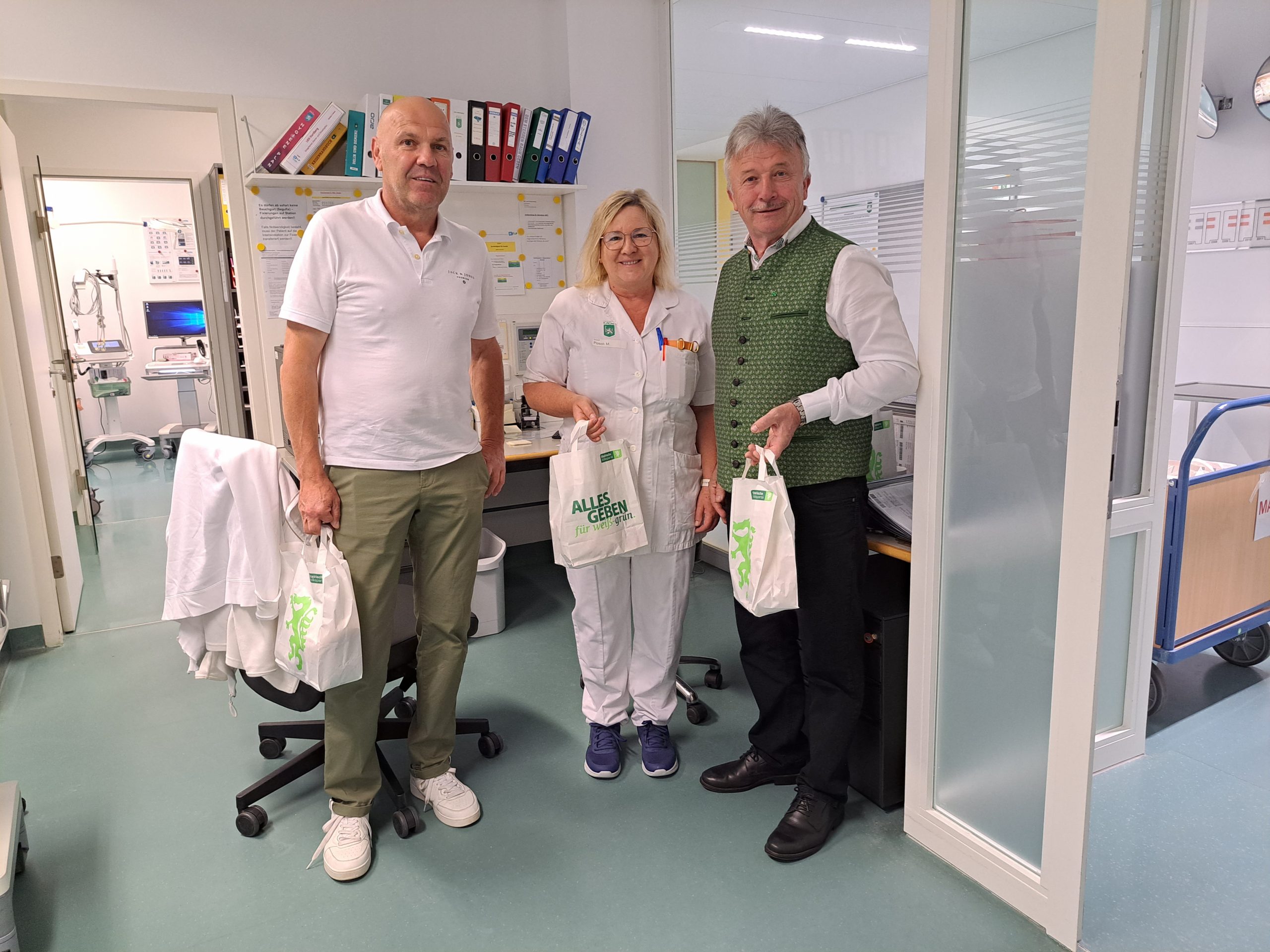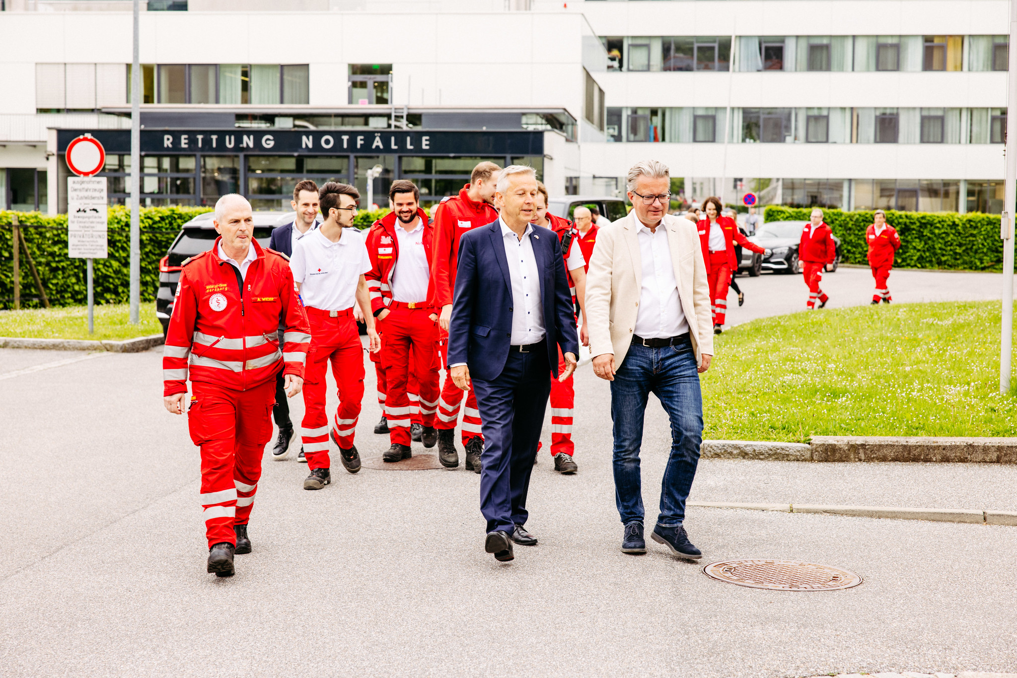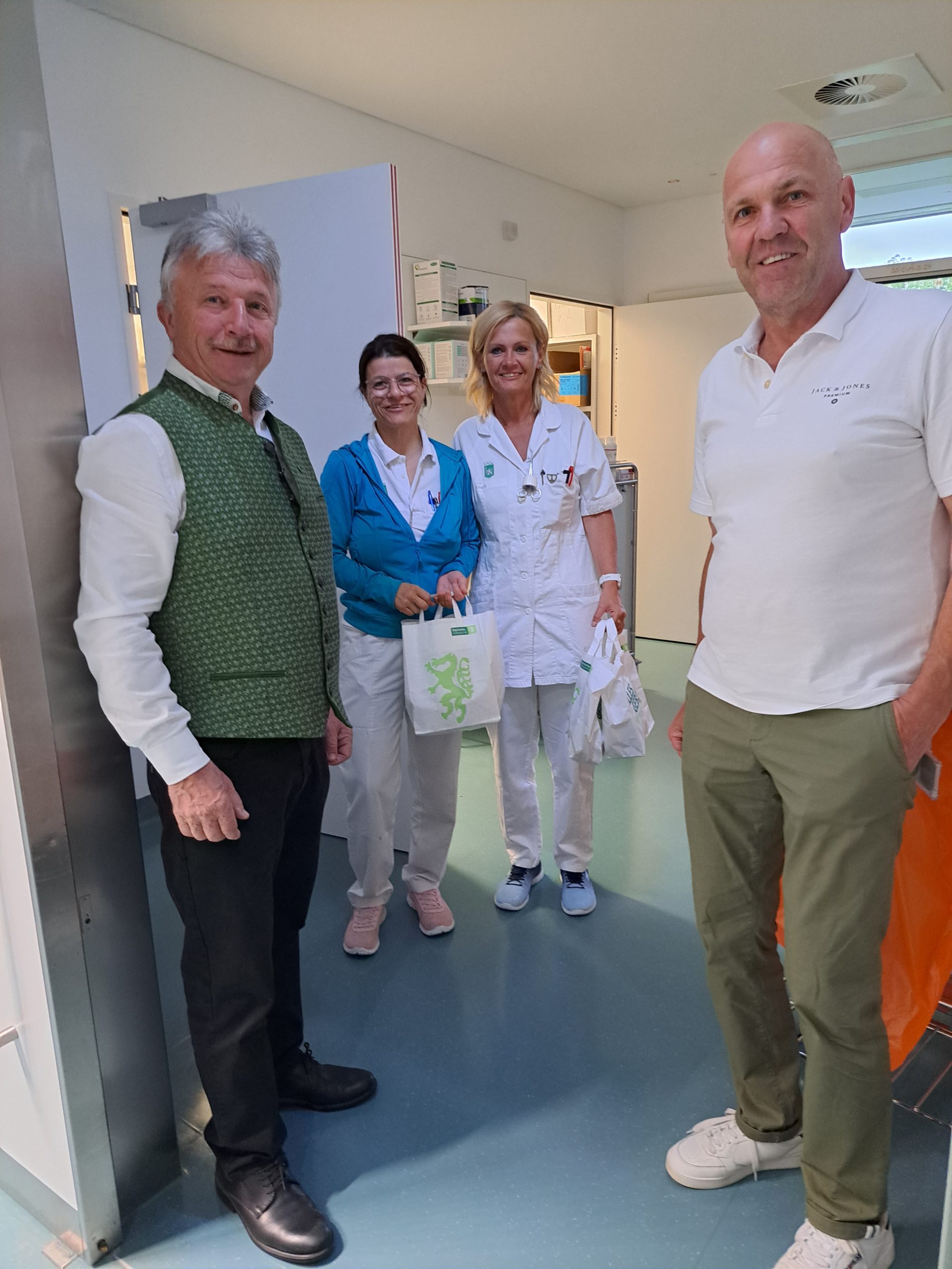 Danach stand gemeinsam mit EU-Spitzenkandidat NRAbg. Reinhold Lopatka ein Besuch beim Roten Kreuz in Hartberg am Programm. Die Bezirksstelle Hartberg versorgt etwa 67.000 Menschen und hat mehr als 500 freiwillige und berufliche Mitarbeiterinnen und Mitarbeiter. Dabei leisten die Freiwilligen jedes Jahr rund 90.000 ehrenamtliche Stunden im Dienst des Allgemeinwohls. Im Anschluss nahm eine kleine Abordnung der Mitarbeiterinnen und Mitarbeiter des LKH Hartberg stellvertretend für alle Kolleginnen und Kollegen das steirische Frühstück von Drexler und Lopatka entgegen.