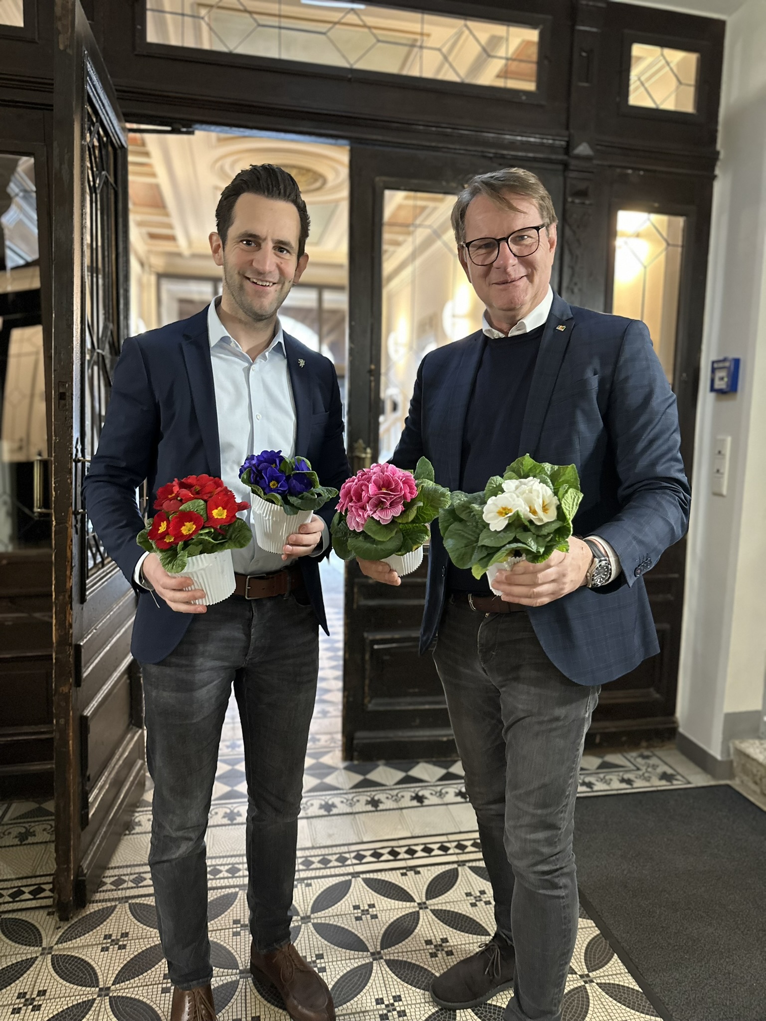 Zum Valentinstag gab es für die Mitarbeiterinnen der Stadtgemeinde Hartberg eine besondere Überraschung: Bürgermeister Marcus Martschitsch und Landtagsabgeordneter Lukas Schnitzer überreichten ihnen einen Blumengruß als Zeichen der Wertschätzung und des Dankes.