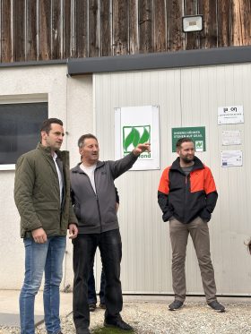 Danach ging es weiter zum Bauernhof von Christian Simon in Sparberegg (Gemeinde Pinggau). Simon betreibt dort mit seiner Familie seit zehn Jahren einen Bio-Hühnermastbetrieb. Auch Bürgermeister Sebastian Wolf und Vizebürgermeister Philipp Luckerbauer nutzten die Gelegenheit, sich vor Ort ein Bild vom Betrieb zu machen.